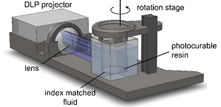 The first step is to convert the 3D model into a form suitable for printing. Instead of slicers, which are used to create the instructions for FDM, resin, and other traditional printers, a projection software is used to take computed tomography (CT) scans of the model. These scans are then projected onto a photopolymer resin volume, which solidifies in the presence of blue light (4-5 nm wavelength). This volume, which is shaped like a vial, is placed in a cuboidal glass container filled with a fluid that has the same refractive index as the glass. This is done because the vial’s round surface area would cause the blue light to reflect and refract, creating undesirable geometries. The vial and the photopolymer resin inside rotate, and the projection software projects frames at the speed at which the vial rotates, activating the photo initiator in the resin, which causes the monomer molecules in the resin to chemically bond, forming the 3D model.